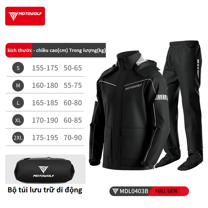 Size áo mưa bộ MOTOWOLF: S, M, L, XL, 2XL